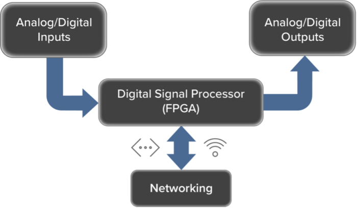 Figure 2: IoC has four main components. An FPGA or similar signal processing chip, analog and/or digital inputs, analog/digital outputs and a network connection for data saving and user interface control.